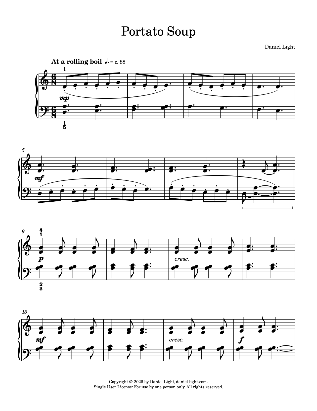 Portato Soup is a lively, lilting, late elementary piece in 6/8 meter. I wrote the piece for the specific purpose of introducing early-level students to the concept of portato touch.